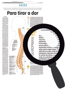"A especialista em quiropraxia Beatriz Ribeiro Esteves compara a coluna vertebral ao carro: desalinha à medida que você usa. Carregar o filho, viajar apertado no avião e até sentar com a carteira no bolso de trás da calça pode provocar movimentos imperceptíveis que causam desalinhamento da estrutura óssea. Originária dos Estados Unidos, a técnica cujo nome vem do grego (quiro significa mãos, e praxia, prática) visa reposicionar vértebras fora do lugar com movimentos rápidos e precisos.